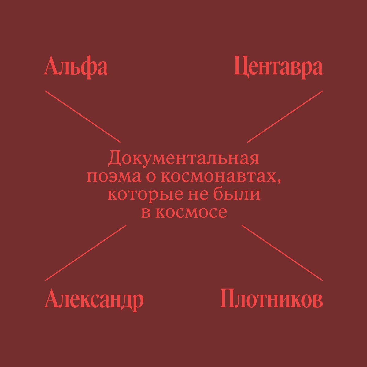 Alpha Centauri is a documentary poem by director and playwright Alexander Plotnikov about astronauts who never travelled into space. The book addresses the lives of those in the profession who never made a single space flight or didn’t come back alive. The typography on the book’s cover, designed by Maxim Balabin, is executed through Roslindale Text by David Jonathan Ross, while additional typography (page numbers, chapter titles) is set in Elma Trio by Philipp Neumeyer.