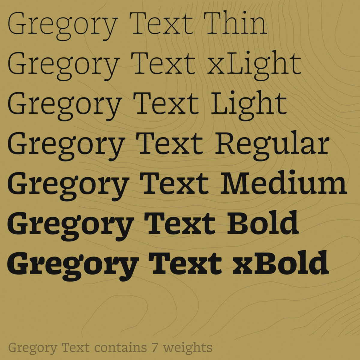 With moderate stroke contrast and unusual shapes, Gregory Text reinterprets the historical aesthetic of early Slab Serif metal types to fit today’s demands. The result is a typography that prefers home touches and obvious ink-traps to ‘rational’ geometry. The family’s warmth is reflected in its chunky, softly-curved serifs and square-ish, doughy countershapes; and even in its more-delicate lighter weights.