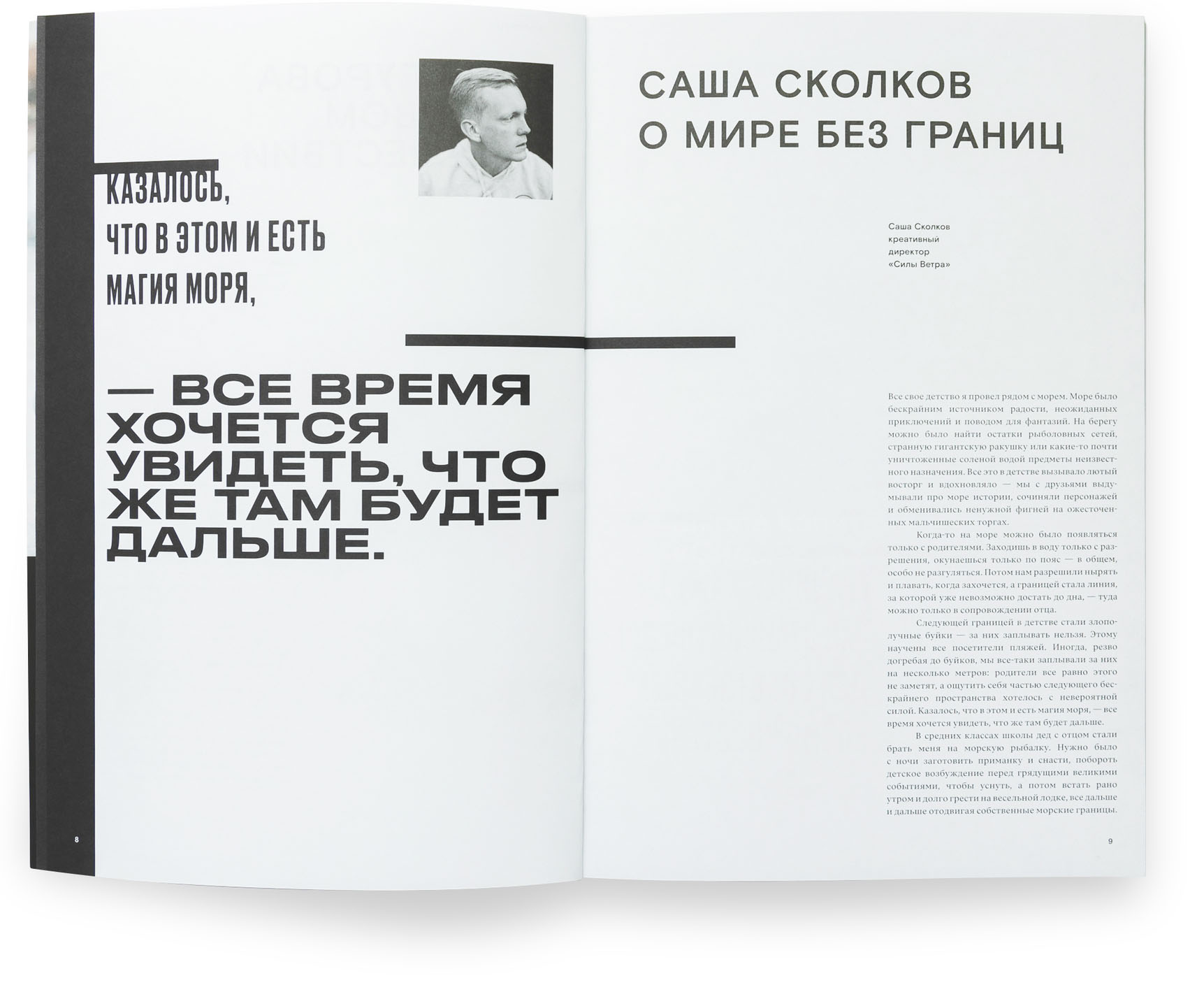 I am the art director at Sila Vetra. When we were publishing a manual for captains, for me it was crucially important to put a woman on its cover. Because one third of captains at Sila Vetra are female. Whereas the general image is quite the opposite: a rather toxic engagement for super masculine people with clenched jaws. There’s no way a girl could imagine that she is able to manage a 50-feet yacht with ten people aboard, — even though they are perfectly good at it. And it is not even about pushing the reality somewhere, reshaping it, but rather about catching up with an already existent reality through the representation. I truly want such solutions to be included into the design process. If you ask me, I would introduce, within design, a certain profession called design-editor — the one who looks at the story, at the meaning of the project. I tend to gravitate toward something like that, actually. And then there will be a design-designer who would implement it better than me. Together, we’ll beat them. Teamwork is a saver. If there’s anything I understood during the last year of torment is that team is key. If you have a team, you can do anything. If you don’t, you can do nothing. No man is an island.