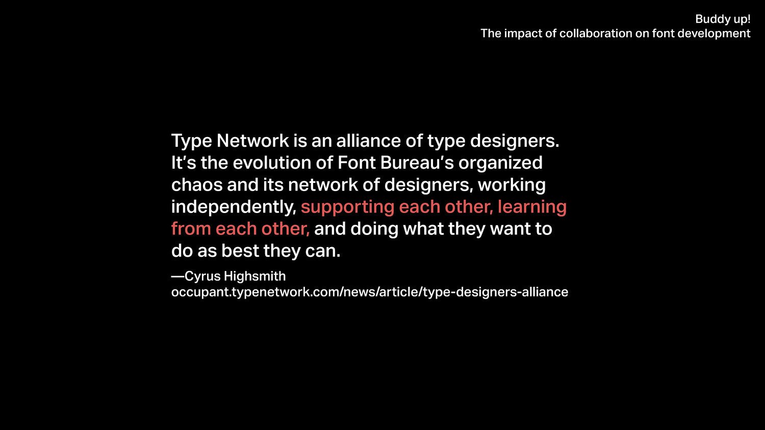 Пояснение от Бьянки: «В своём выступлении я рассмотрю, как открытый диалог между коллегами может не только улучшить ситуацию в индустрии и качественно повысить результат работы, но и сделать сильнее наше профессиональное сообщество и помочь нам расти как личностям. Приводя в пример три-четыре недавние коллаборации, я расскажу как о достоинствах, так и о сложностях междисциплинарного сотрудничества. В частности, я бы хотела подчеркнуть влияние командной работы на профессиональное развитие отдельных людей, особенно стажёров, студентов и новичков в индустрии шрифтового дизайна. Я постараюсь ответить на следующие вопросы: как обмен идеями, знаниями и опытом увеличивает творческий потенциал и инновационность в дизайне и технологии изготовления шрифтов; как мы взаимодействуем с новичками, дизайнерами без опыта; как передача знаний и навыков помогает нашему сообществу измениться в лучшую сторону; как добиться в команде и во всём сообществе атмосферы, располагающей к сотрудничеству, и создать среду, в которой коллегам будет комфортно открыто обсуждать свои и чужие работы; как, что и почему мы узнаём друг от друга».