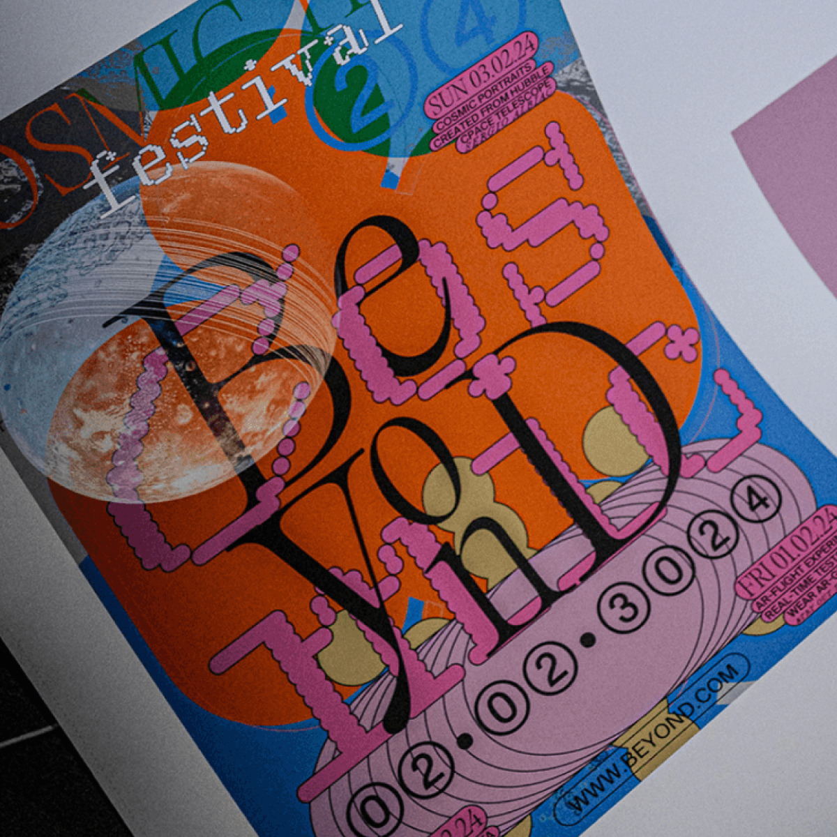 Beyond — фестиваль космического туризма, который пройдёт в 3024 году. Его придумала в рамках студенческого проекта Анастасия Бушуева из Нюрнбергского технического университета. За типографику в айдентике фестиваля отвечают Rene Фёдора Аброськина, Suisse Int’l Swiss Typefaces и Editorial New Pangram Pangram.