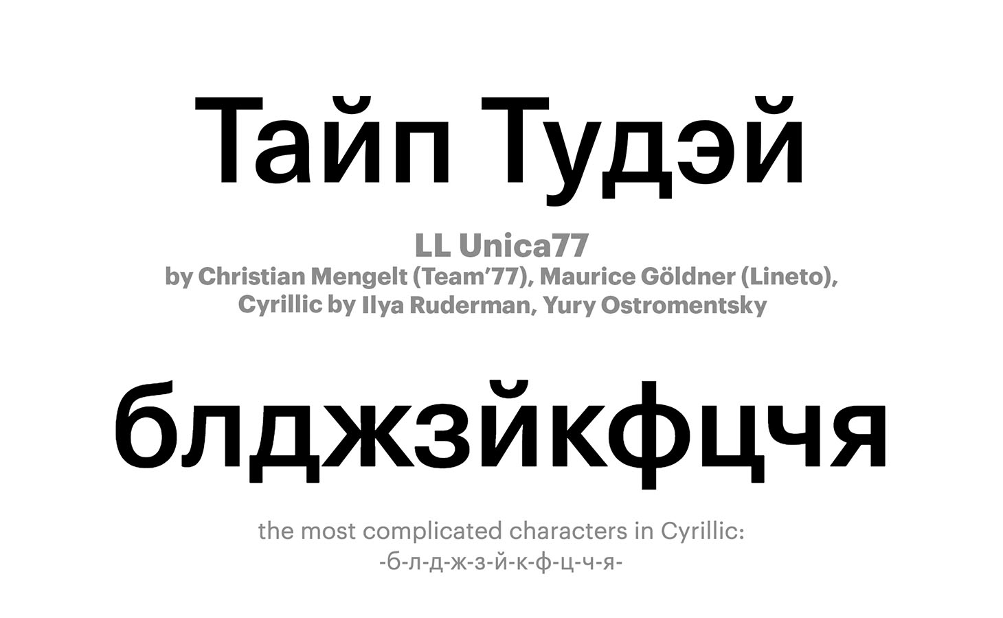 LL Unica77 by Christian Mengelt (Team’77), Maurice Göldner (Lineto),Cyrillic by Ilya Ruderman, Yury Ostromentsky