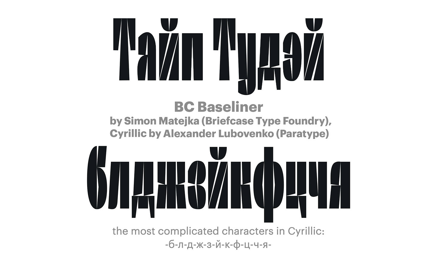 BC Baseliner by Simon Matejka (Briefcase Type Foundry), Cyrillic by Alexander Lubovenko (Paratype)