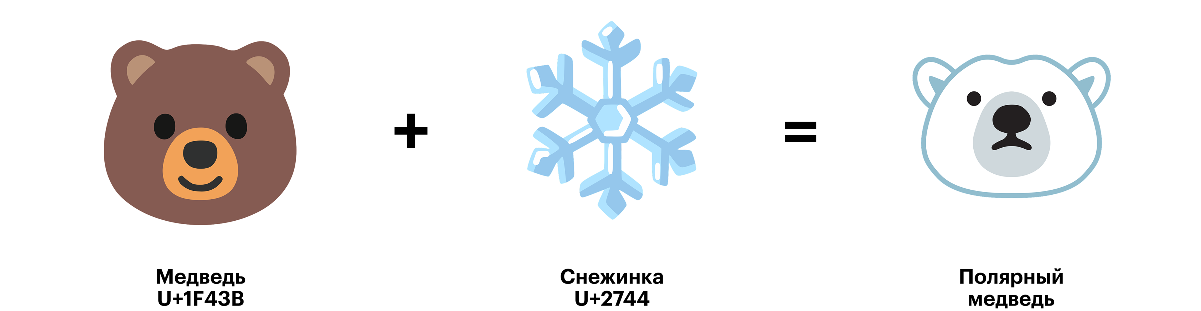 Некоторые из привычных нам эмодзи устроены как лигатуры. С помощью специального символа Zero Width Joiner, который «склеивает» лигатуры, несколько эмодзи с разными значениями превращаются в один.