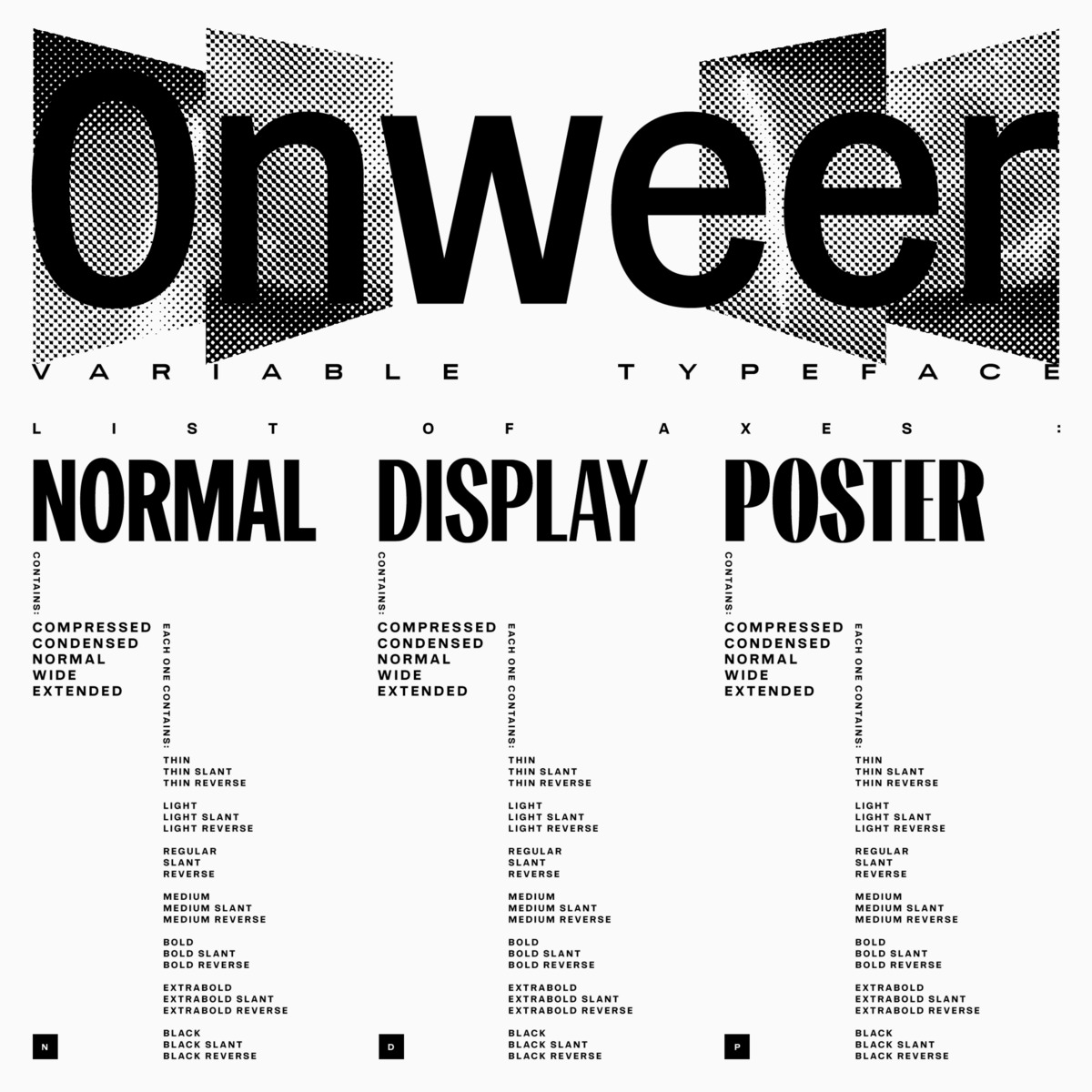 В вариативном Onweer есть немного ностальгии по Franklin Gothic, своеобразная тихая роскошь и деликатная ось контраста. Но шрифт можно легко заставить звучать громче с помощью оси наклона (с диапазоном от −20 до 20 градусов). Onweer заимствует немногое у своего исторического прототипа и радикально переосмысляет его в суперзакрытых формах стилистического сета №3.